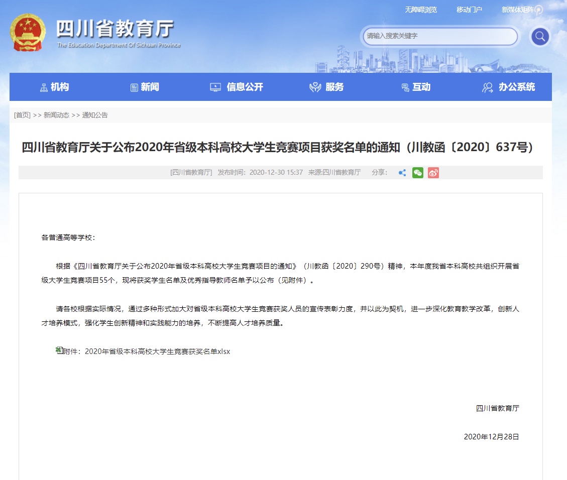 12月31日,2020年四川省大学生原创动漫大赛评审结果在四川省教育厅和四川省本科高校竞赛平台官网上陆续公布,欧冠官网学生取得佳绩,获得一等奖1项、二等奖2项、三等奖9项,南京、刘婉毅获得“优秀指导老师”。