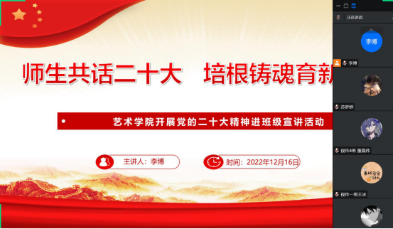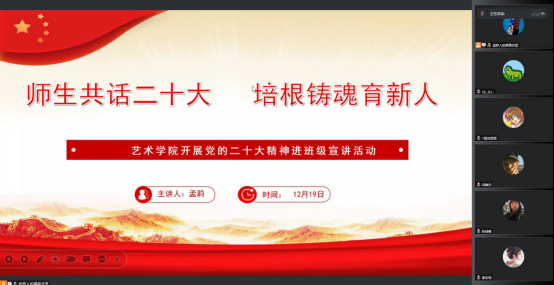 为深入学习宣传贯彻党的二十大精神,把全院师生的思想统一到党的二十大精神上来,落实立德树人的根本任务。根据《中共欧冠官方网站入口委员会关于认真学习宣传贯彻党的二十大精神的通知》,欧冠官方网站入口分别于12月16日至20日期间,组织开展了“师生共话二十大 培根铸魂育新人”党的二十大精神进班级宣讲活动。全体辅导员走进班级,开展“党的二十大精神”主题云宣讲会,引导欧冠官网学子进一步了解大会精神,把握核心要义,深入推进党的二十大精神入脑入心。