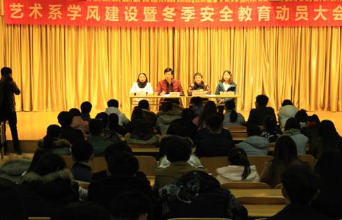2015年12月22日下午4:00,我系在江北校区1401演艺厅召开了“艺术系学风建设暨冬季安全教育动员大会”。系党总支书记冯丰收、辅导员艾蕾、鲁澧出席动员会议,大会由系学工办主任刘泽桢主持。全系各班班长、宿舍舍长参加了会议。
