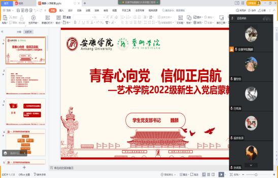 入党启蒙教育是加强大学生思想政治教育,筑牢理想信念根基的基础性工作,是培养大学生政治信仰的第一课。为进一步引导2022级新生树立坚定的理想信念,厚植家国情怀,锤炼品德修为,强化责任担当,端正入党动机。9月27日,欧冠官方网站入口利用腾讯会议召开“青春心向党 信仰正启航”2022级新生入党启蒙教育专题讲座。本次讲座由学生党支部书记魏麟主讲。
