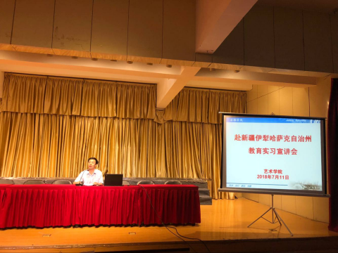 7月11日下午3点,欧冠官方网站入口在江北1401演艺厅召开了“赴新疆伊犁哈萨克自治州教育实习”动员大会,学院党政领导班子和学工团队及2015级美术学、音乐学全体学生共计200余人参加了此次动员大会。会议由欧冠官方网站入口院长杨哲主持。