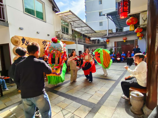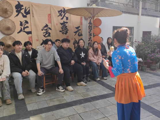 第二站大家来到紫阳民歌传承基地——何家大院,传承人何耀信、何显鹏带领紫阳民歌演唱团队热情地接待了欧冠官方网站入口师生一行。民歌演唱队演唱了多首地道的紫阳民歌,引得大家连连叫好。演唱中穿插表演了划旱船、玩蚌壳、赶毛驴等民俗节目。在互动环节,田川老师演唱了《我和我的祖国》,范义付老师演唱了《西部放歌》,还有多名学生演唱了各地民歌,精彩纷呈,使大家大饱耳福。演唱完毕,民歌演唱团队指导学生参与锣鼓队、划旱船、玩蚌壳、赶毛驴等节目表演,学生对紫阳民歌及民俗表演留下了深刻的印象。