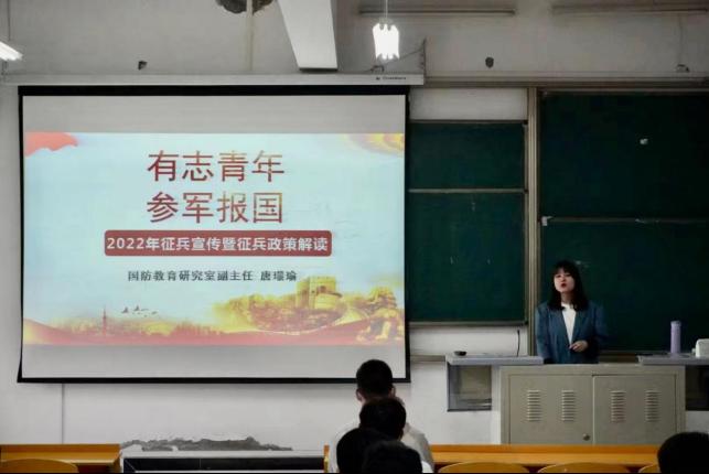 唐璟瑜以“有志青年,参军报国”为主题,从携笔从戎无上光荣、应征入伍体检标准、应征入伍相关政策、保留学籍及复学手续办理等方面详细解读了应征入伍相关事项,并重点讲解了同学们关心的学校在读生尤其是毕业生入伍的国家优惠政策,鼓励同学们积极响应国家号召,踊跃报名参兵入伍,携笔从戎,报效祖国,到火热的军营放飞梦想,到百炼成钢的熔炉中磨砺青春。