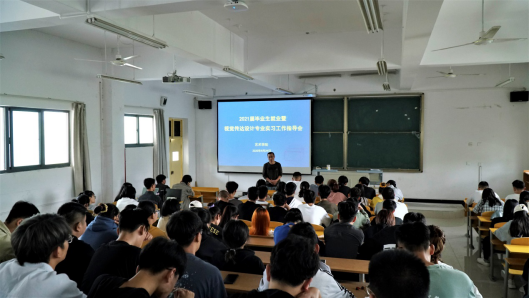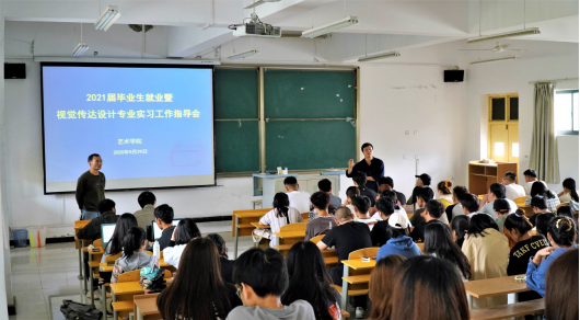 9月29日上午欧冠官网在江北校区2101教室召开了2021届视觉传达设计专业毕业生实习暨就业指导工作专题会。会议由辅导员杨厚东主持,邀请了设计系主任吴波参加,2021届视觉传达设计毕业生110多人到会聆听。