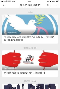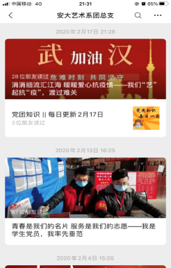 党有号召,团有行动。在疫情防控期间团总支书记薛涛向各个团支部传达了《共青团中央关于坚持党的领导,全团动员,在防控疫情阻击战中充分发挥共青团生力军和突击队作用的通知》精神,积极号召广大团员青年听党话、快行动,用自己的实际行动积极参与这场疫情防控阻击战当中,在此涌现了孙梦雲、张转云等优秀青年团员投身到家乡疫情防控志愿服务当中。同时,认真安排、组织、引导各团支部做好“青年大学习”网络主题团课学习工作。通过学习认真领悟习近平总书记关于疫情防控的重要指示精神,帮助青年团员坚定信心、科学预防。此外,以学院专业特色为出发点、“团小艺”微信公众号为平台,策划“执笔战‘疫’”、“跟着小艺拍视频”、“小艺喊你学防控”等系列线上活动,每天通过微信公众号推送与抗击疫情的好消息、正能量,引导大家坚定信心、共克时艰。薛涛强调到作为新时代中国青年,众志成城抗击疫情就是当前最重要的任务,这种时候共青团员就是要举旗帜、亮身份、展作为,党旗所指就是团旗所向!
