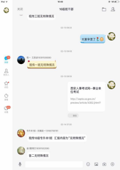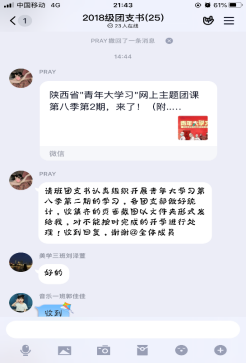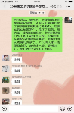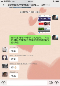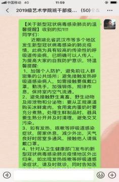 2.做好疫情期间的指导者。延迟开学期间,各辅导员通过转发相关文件,推送疫情防控大学生志愿者的先进事迹,教育引导班级学生要承担历史使命,履行社会责任,积极行动,共克时艰。引导学生做好防控措施,尽量居家减少外出,保持乐观的心态面对肺炎疫情。辅导员手机24小时开机待命,有问题的学生随时可以找辅导员进行倾诉,做学生心理疏导的知心人。对于学生的课程教学需求,学院采取“网上直播”的方式开展教学活动,辅导员积极配合学生网络学习工作,指导学生做好线上学习准备工作,及时通知课程信息。学工办主任鲁澧转发一流高校免费公开课程信息,引导学生利用假期时间,摆脱懒散状态,用学习充实居家生活。针对毕业班学生所面临的毕业论文、就业等问题,辅导员艾蕾积极联系学生和导师通过网络和电话等方式进行指导,搜集招聘信息、发布网络招聘时间安排表至班级群中,使毕业班学生做到招聘信息早知晓早行动。