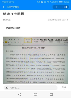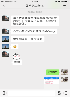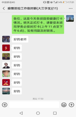 1.做好疫情期间的统计者。在疫情防控期间,各辅导员立即通过QQ、电话、微信等各类方式开展宣传教育、统计工作。学校疫情防控系统“我在校园---健康打卡”上线后,为确保学院学生打卡数据的准确和及时,辅导员们投身于每日疫情信息填报的工作当中,担当每日打卡的统计者和把关人。辅导员杨厚东利用“我在校园”平台发布“健康打卡通报”信息,悉心指导、认真总结每日打卡情况,做到问题早发现早解决。每天在截止时间即将到来的半小时内,总能看到辅导员在各自班级群中在@大家,坚持做到一个不少、一个不漏,准确上报全院学生信息。
