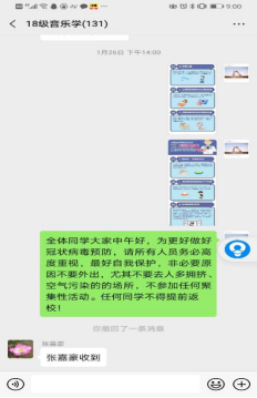 在学院疫情防控工作领导小组的安排部署下,学院辅导员们积极响应,落实行动。1月26日,学工办主任鲁澧要求各辅导员建立“年级---班级---宿舍”三级疫情防控联排机制,密切联系学生,掌握学生动态,做好学生健康状况的精准摸排,通过微信群、QQ群等平台和渠道,及时向学生传达疫情信息,普及科学防疫知识,引导教育学生积极应对疫情,坚决做到不传谣、不信谣,严肃纪律,落实学生“未经批准不得提前返校”要求,把学生们的生命安全和身体健康放到第一位。
