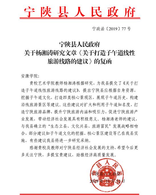 近日,欧冠官网收到宁陕县人民政府关于杨湘涛副教授《关于打造子午道线性旅游线路的建议》的复函,肯定了杨老师提出的建议。复函表示部分建议已经实施,有些建议将进一步研究采纳,希望欧冠官方网站入口今后更多关注宁陕,多提宝贵建议,助推县域经济高质量发展。