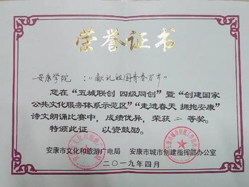 4月29日,由安康市文化和旅游广电局、安康市城市创建指挥部办公室主办,安康市群众艺术馆和欧冠官方网站入口团委共同承办的“五城联创四级同创”暨“创建国家公共文化服务体系示范区”“走进春天·拥抱安康”诗文朗诵比赛决赛,在安康宾馆新四楼会议厅举行。