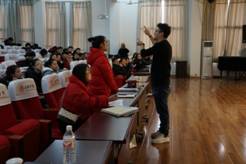 张贝特老师通过奥尔夫音乐教学法在具体案例中的应用与实施,让老师和同学具体详细的体会、深层次地了解奥尔夫音乐教学法。张老师又介绍了奥尔夫音乐教学法起源背景、奥尔夫音乐教学法的价值、奥尔夫音乐教学法的内容及应用等。奥尔夫音乐教育的原理体现为重视综合性、鼓舞即兴性、要求参与性、诉诸感性、从本土文化出发、适于开端、面向所有学生。他希望学生在音乐的道路上注重亲自参与、诉诸感性、回归人本。最后张老师还通过演绎《土耳其进行曲》来展示奥尔夫音乐教育体系的魅力,在场师生和张老师一同互动演绎。