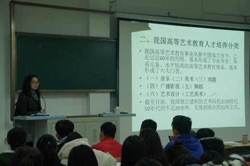 随后,鲍院长为同学们剖析当前我国文化艺术产业对艺术类人才需求的特点。她特别强调,当前社会对应用型艺术人才需求量在不断增长,同时,传统艺术人才的市场也有了新的突破;市场对新型复合型艺术人才的需求相对较大,纯艺术类人才的需求量相对有限;新行业催生新的市场需求,文化创意产业也需要艺术类人才;社会艺术培训行业呈现快速发展态势,将会成为21世纪最有前途的发展行业之一。艺术类人才在就业方面具有渠道多、门槛低、从业灵活的特点,同时也存在传统艺术就业难的局面。