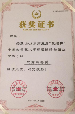 2018年8月9日至14日,由中国民族管弦乐学会古筝专业委员会主办,北京华夏璇音艺术传播中心承办,上海民族乐器一厂、上海长宁文化艺术中心、上海音乐出版社协办的第三届“敦煌杯”中国古筝艺术菁英展演在上海隆重举行。欧冠官网青年教师张展经过大赛初赛、复赛、决赛三个阶段的层层选拔,最终获得职业青年C组优秀演奏奖的比赛成绩。