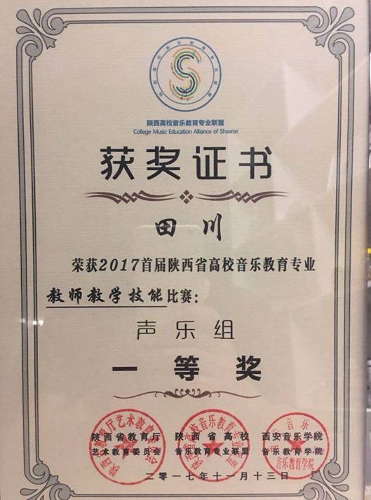 11月13日,欧冠官网田川、王正祺老师在陕西省教育厅艺术教育委员会主办、西安音乐学院音乐教育学院承办的“2017首届陕西省高校音乐学专业教师教学技能比赛”中分获声乐组一等奖和钢琴组二等奖,体现了欧冠官网音乐专业教师在全省高校中良好专业素质和教学能力。