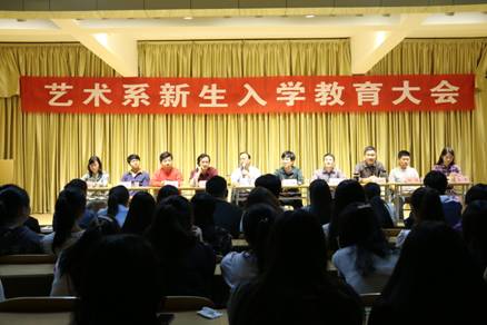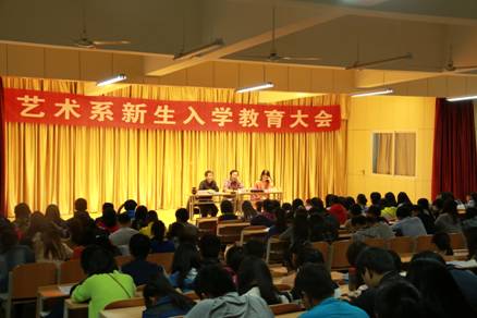 我系于2014年9月21日在1401演艺厅召开了新生入学教育动员大会,会议在庄严的国歌声中开始,系主任单福东、党总支书记冯丰收、系副主任雷升录、办公室主任肖剑、绘画教研室主任孙海洋、音乐教研室主任田川、设计教研室主任吴波、团总支书记黄娟、2014级辅导员艾蕾及2014级全体新生参加了动员大会。系学工办主任刘泽桢主持了大会。