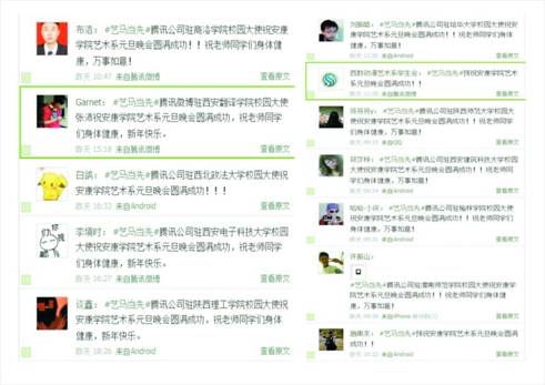 现场腾讯微博互动。我们的晚会得到了腾讯公司的大力支持,在晚会现场,陕西师大、西安交大、西安电子大学等高校通过腾讯微博都纷纷发来贺电,预祝艺术系“艺马当先”元旦晚会圆满成功,这是我们起初没有预想到的,进一步扩大了欧冠官网的社会影响,不得不感慨微时代的辐射力和影响力。现场观众的微博互动更为晚会增添许多的乐趣。微博的滚动抽奖也为现场的六名观众带来的新年的幸运。