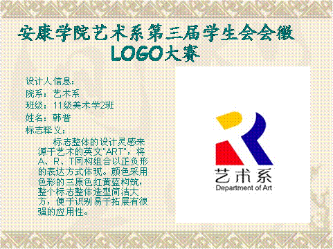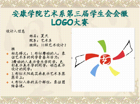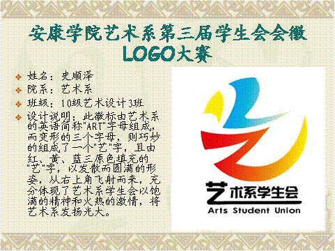 我们相信,有了会徽后的艺术系学生会将更加有组织性,更能体现凝聚力,更好地发扬自我教育、自我管理、自我服务的职能,从而推动我系各项工作进一步向前发展。
