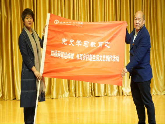 大会第一项,党总支副书记李万明为美术支部党史学习教育之--“如椽画笔绘峥嵘 书写乡村新生活”文艺创作活动进行授旗。2021年将迎来建党100周年华诞,选择石泉后柳、岚皋南宫山等乡村振兴示范点作为此次创作写生基地,就是要在青年学生中落实“立德树人”的根本任务,将“学史明理、学史增信、学史崇德、学史力行”贯穿到教学实践的各个环节。希望同学们通过手中的画笔,在淳朴的民风中汲取养分,用如椽画笔展现“乡村振兴”新画卷,精心绘画出祖国的大好河山,描摹出人民的幸福百态,以优异的作品献礼党的100周年华诞。