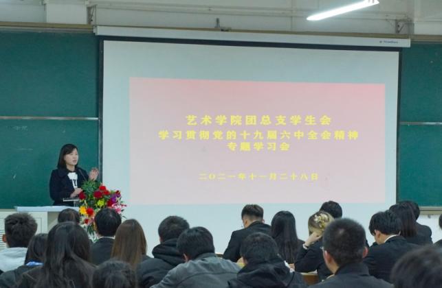 黄娟对全体学生干部进行了学习贯彻党的“十九届六中全会”精神的专题宣讲。她指出,党的十九届六中全会系统全面总结了我们党百年奋斗的重大成就和历史经验,揭示了我们党不断从胜利走向新的胜利、创造新的历史的光辉历程,对推动全党进一步统一思想、统一意志、统一行动,团结带领全国各族人民夺取新时代中国特色社会主义新的伟大胜利,具有重大现实意义和深远历史意义。作为一名新时代青年学生干部,要强化责任担当,主动团结凝聚身边青年坚定不移听党话跟党走,让广大青年把个人追求融入到为实现第二个百年奋斗目标、实现中华民族伟大复兴的中国梦而不懈奋斗的进程之中。同时,对新一届团总支学生会干部提出三点希望和要求:一是加强政治理论学习,坚定理想信念,彰显充满朝气、积极向上的青春底色。二是加强自身思想作风建设,遵守纪律要求和规范,平衡学习与工作的关系,发挥学生干部的榜样示范效应。三是牢记学生干部职责,乐于奉献,勇于担当,不辜负学院老师和同学们的期望。