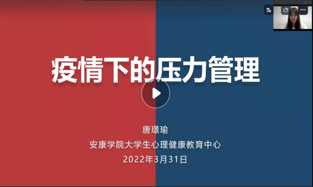 为切实做好常态化疫情防控工作,帮助学生有效缓解因疫情而产生的心理压力,进一步提升心理调适能力,3月31日晚,欧冠官方网站入口邀请大学生心理健康教育专职教师唐璟瑜作主题为“疫情下的压力管理”线上心理讲座。2021级学生聆听了讲座,讲座由辅导员孟莉主持。