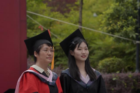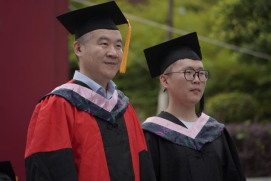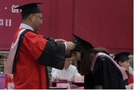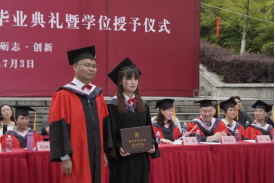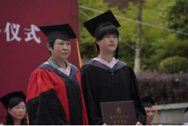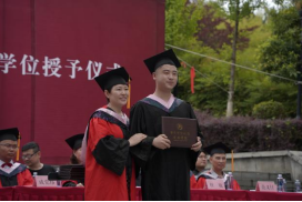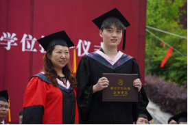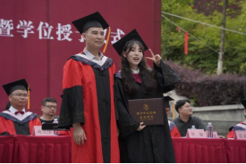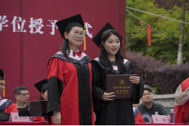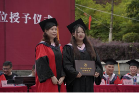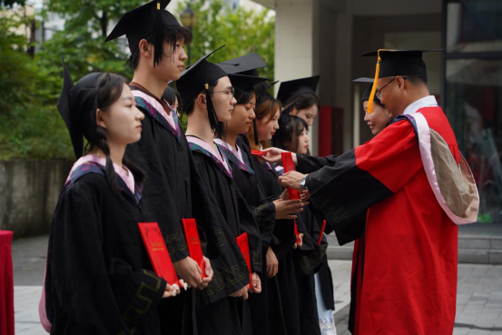 伴随着动听歌声,学院院长成党伟和导师们为毕业生们一一正冠拨穗,颁发学位证书,并合影留念。