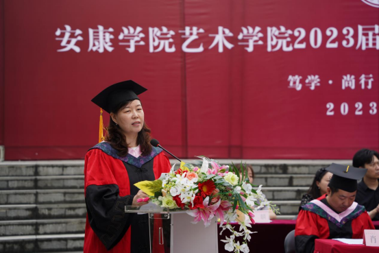 教师代表谢敏希望同学们能以妙笔生花的作品、别出心裁的设计、娓娓动听的音乐来谱就属于自己崭新的未来;更希望同学们以志存高远的勇气、恪己守正的骨气、自信乐观的底气来书写精彩的人生篇章。