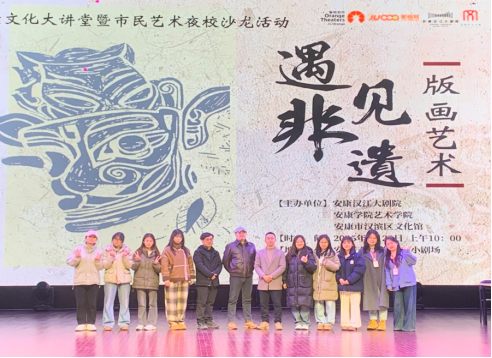 近日,欧冠官网青年教师毛德龙带领美术学部分学生赴安康汉江大剧院做非遗版画讲座及体验活动。本次活动由安康汉江大剧院、欧冠官方网站入口欧冠官方网站入口、安康市汉滨区文化馆共同主办,市民夜校60余名学生参与。
