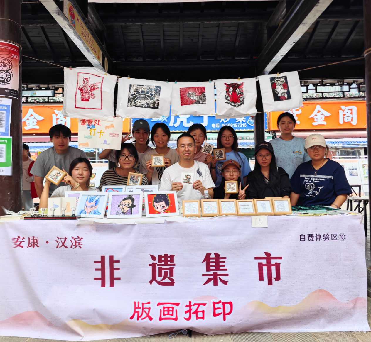 活动现场,同学们精心布置的非遗版画展区氛围热烈。在毛德龙老师的悉心指导下,学生们提前将安康独特的自然风光、民俗文化等元素雕刻成版,将刻板上丰富的线条与图案完整保留,现场重点引导游客体验拓印环节。在一幅幅雕刻精美的版画模板前,学生们热情地向游客介绍版画历史、制作工艺,细致讲解拓印技巧,从调配油墨均匀涂抹在刻板表面,到铺上宣纸用工具轻柔按压,再到缓缓揭开宣纸呈现完整图案,每个步骤都耐心指导。