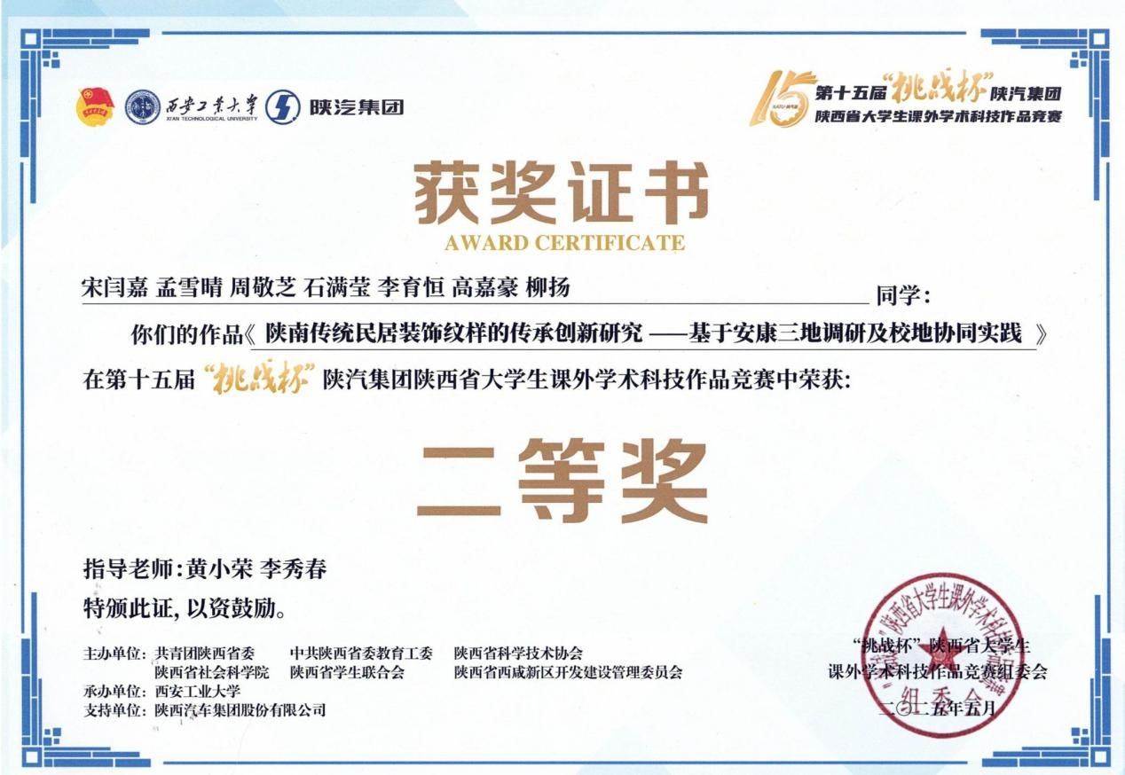 近日,由团省委、省委教育工委、省科协、省社科院、省学联与省西咸新区管委会联合主办、西安工业大学承办的第十五届“挑战杯”陕汽集团陕西省大学生课外学术科技作品竞赛落下帷幕。我院黄小荣、李秀春和吴丹老师指导的宋闫嘉、张博等学生在竞赛中表现优异,分别斩获二等奖、三等奖,展现出扎实的学术素养与创新能力。