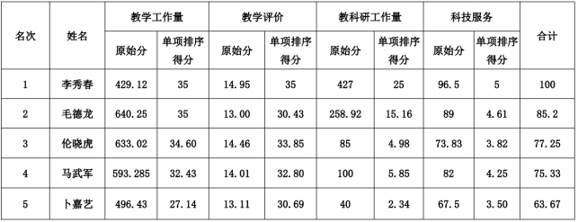 注:按照《欧冠官方网站入口讲师职称评审实施细则》第三章第六条之规定“担任专职教学秘书、行政科研秘书的教师晋升讲师职称年均教学工作量达到80学时视为满工作量”,李秀春教学工作量为35分。