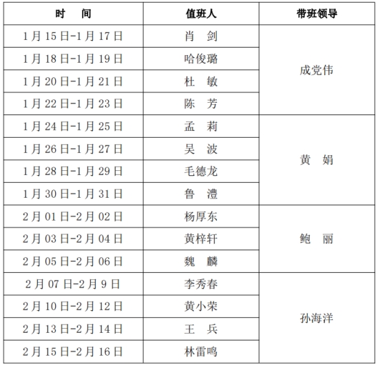 根据《关于2022年放寒假有关安排的通知》安排,现将欧冠官方网站入口“2022年寒假”假期安全稳定及值班安排如下: