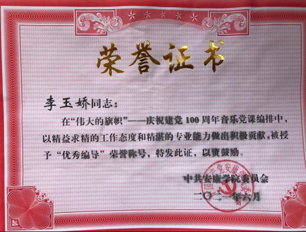 党委副书记、纪委书记、监察专员安永强宣读了学校党委《关于对“辉煌百年·七个一”系列活动进行表彰的决定》及获奖先进集体和个人名单。欧冠官网在“伟大旗帜”——庆祝建党一百周年音乐党课中荣获突出贡献奖,肖剑、李玉娇获“优秀编导奖”;学生党支部报送的微视频——《艺心向党》荣获“我和我的支部”故事征文(微视频)大赛一等奖。