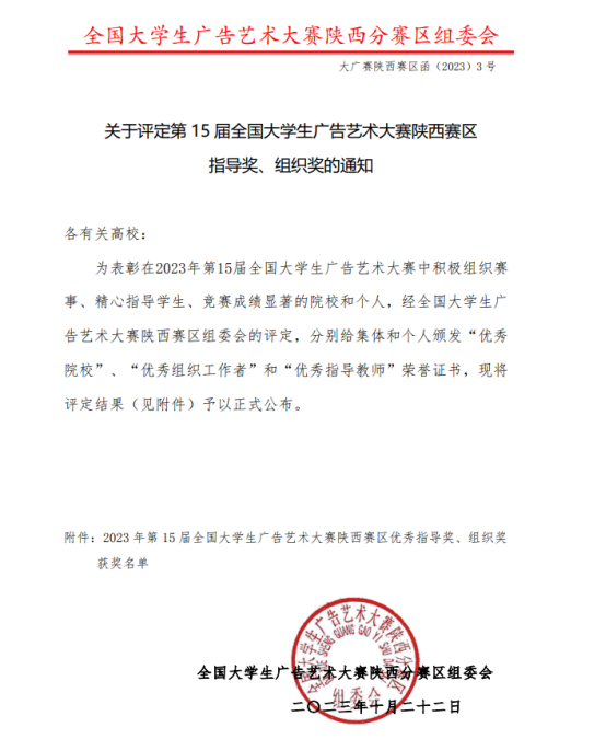 近日,2023年第十五届全国大学生广告艺术大赛陕西省省赛评审结果揭晓,欧冠官网欧冠官方网站入口师生再创佳绩!获得省赛一等奖1项、二等奖10项、三等奖5项,优秀奖29项。欧冠官网获“优秀院校”,付苗获“优秀指导教师”,王兵获“优秀组织工作者”。